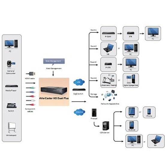 Avec sa technologie multicast sur réseau IP , AVerCaster HD Duet Plus permet d'encoder/streamer et/ou d'archiver un flux vidéo HD à partir de n'importe quelle source vidéo avec une sortie HDMI ou composante, telle que les décodeurs TV, les caméras HD ou les tableaux blancs interactifs. Il devient facile de diffuser en masse des contenus vidéo HD simultanément à un nombre illimité d'utilisateurs sur le réseau IP.