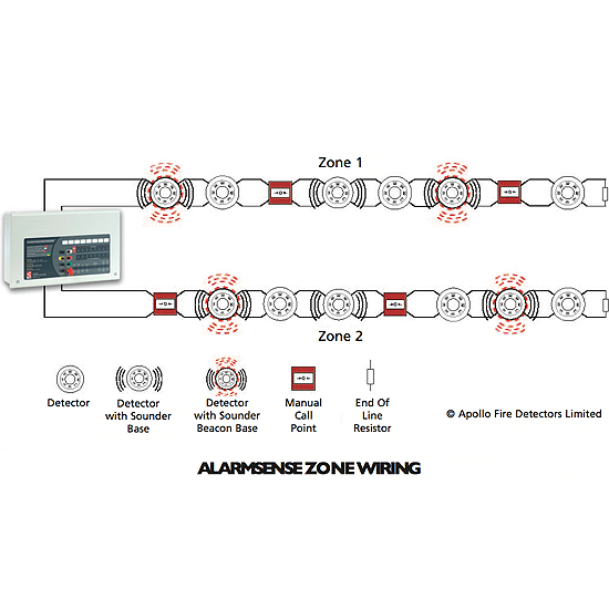 - Deux circuits de zone AlarmSense - compatibles avec les détecteurs, les points d'appel, les avertisseurs sonores et les indicateurs visuels ApollSense d'Apollo.