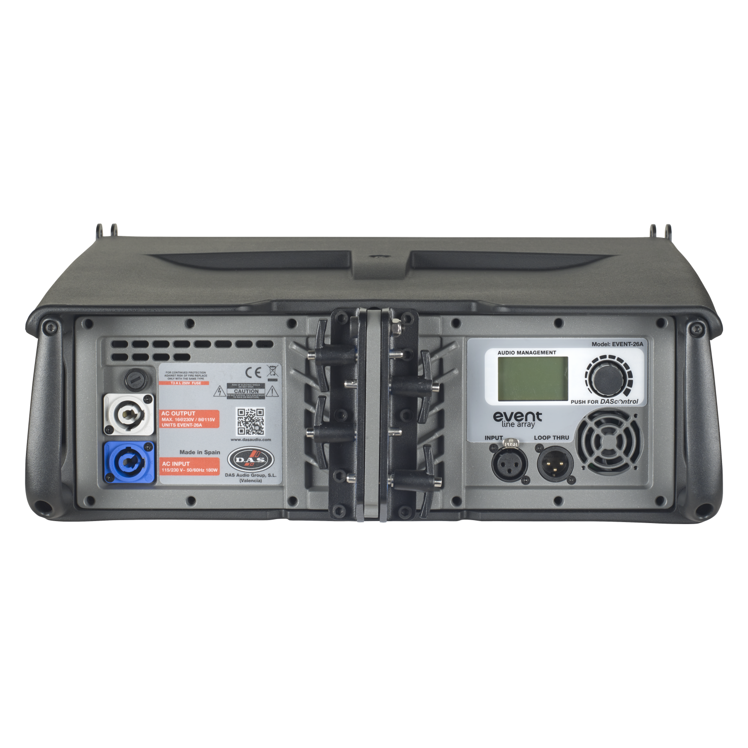 Il est doté d’un amplificateur à deux canaux de classe D qui fournit une puissance de crête de 800 W et qui comprend des connecteurs de qualité sur le panneau arrière Neutrik® XLR et powerCON. L’interface DAScontrolTM permet une sélection rapide et facile des préréglages pour les unités dans les arrays. Le DSP 24 bits de dernière génération gère les fonctions X-over, EQ, delay et limiteur. La puissante technologie de filtrage FIR intégrée à l’EVENT-26A fournit une réponse en phase constante qui se traduit par un son cristallin et une clarté exceptionnelle, améliorant ainsi l’expérience d’écoute.