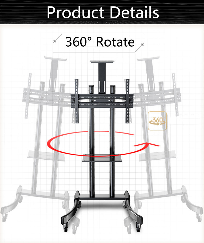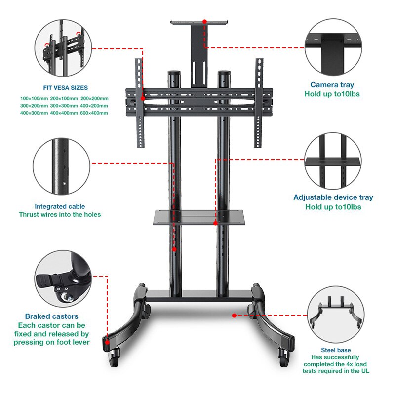- Le cadre en acier du chariot TV permet de monter un téléviseur lourd jusqu'à 75kg; Quatre roulettes freinées pour un réarrangement sans effort
