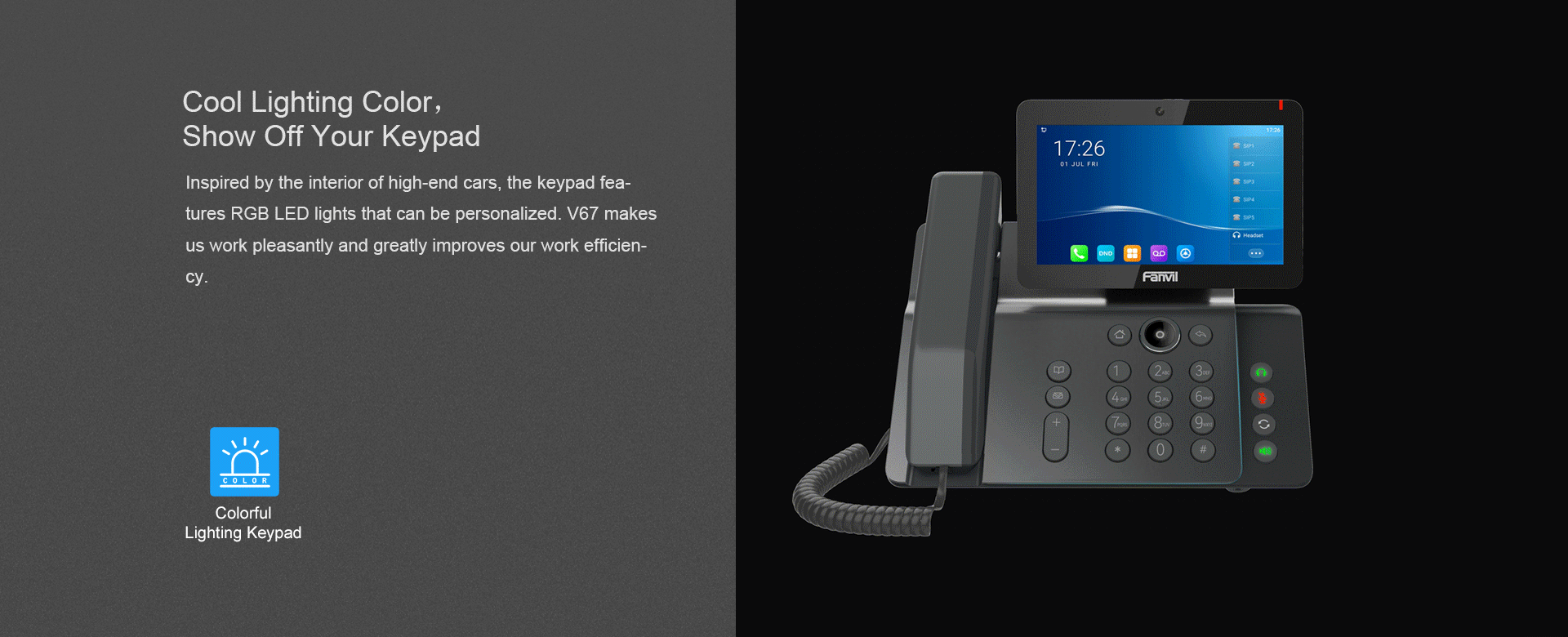 Téléphone vidéo IP Haut Gamme Ecran Tactile 7" 20 Lignes SIP Bluetooth Intégré 116 touches programmables. En tant que téléphone IP d'entreprise haut de gamme avec système Android 9.0, le V67 offre aux utilisateurs une expérience tactile plus intelligente et plus fluide. 112 touches programmable sur l'écran tactile couleur de 7 pouces, WiFi et Bluetooth intégré rendent les communications quotidiennes plus intelligentes et plus simples.Toute petite salle de réunion devient une salle de vidéoconférence assistée de la caméra intégrée de 5mpxs et de l'audio à large bande, offrant une solution de communication tout-en-un pour les cadres, les dirigeants et les communicants.