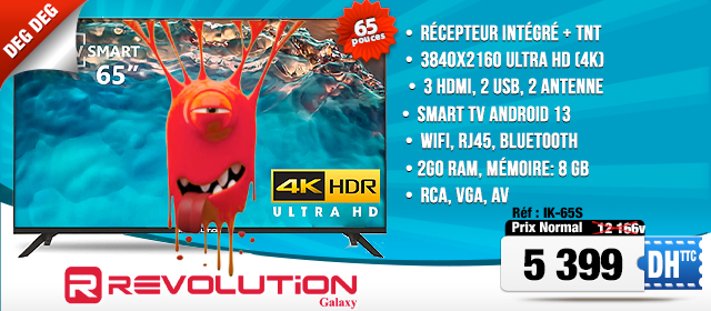 • LED TV 65″ SMART Ultra HD 4K Récepteur Intégré +TNT Revolution Galaxy 65 Pouces S