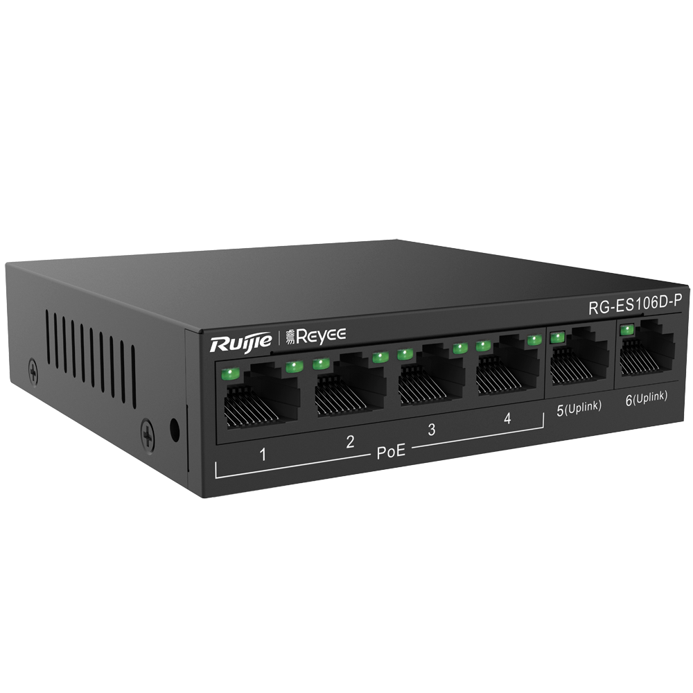 Ruijie RG-ES106D-P - Switch de Bureau 6 Ports RJ45 10/100Mbps 4 Ports PoE+ 802.3af/at 2 Ports Uplink Puissance PoE Totale 58W