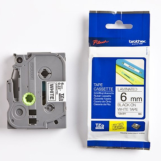 TZE-211 - 6 mm noir sur ruban blanc laminé (8 m) P-touch Brother autocollant.