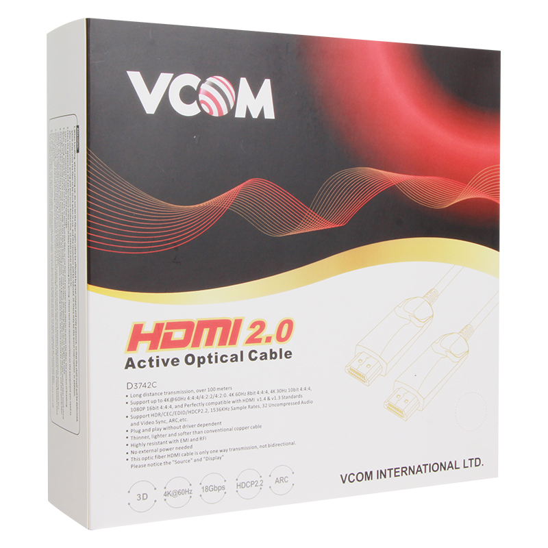 CÂBLE HDMI FIBRE OPTIQUE 2.0 30 METRES HAUTE QUALITE. VCOM HD 4K 60Hz 2.0 Câble HDMI à fibre optique active plaqué or. (VCOM D3742C )