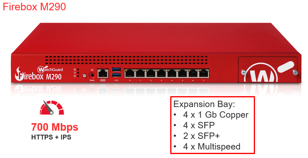 WatchGuard WGM29000701 - WatchGuard Firebox M290 UTM 1,18 Gbit/s HTTPS 696 Mbps avec IPS pare-feu 5,8 Gbit/s (UDP 1518) avec suite de sécurité de base d'un an