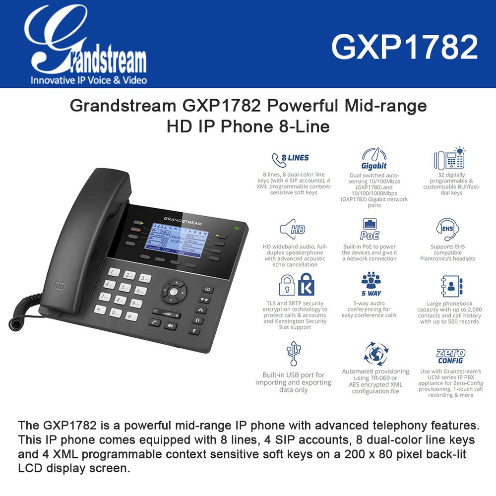 - Téléphone GXP1782, combiné avec cordon, socle, alimentation universelle, câble réseau, guide d'installation rapide, licence GPL