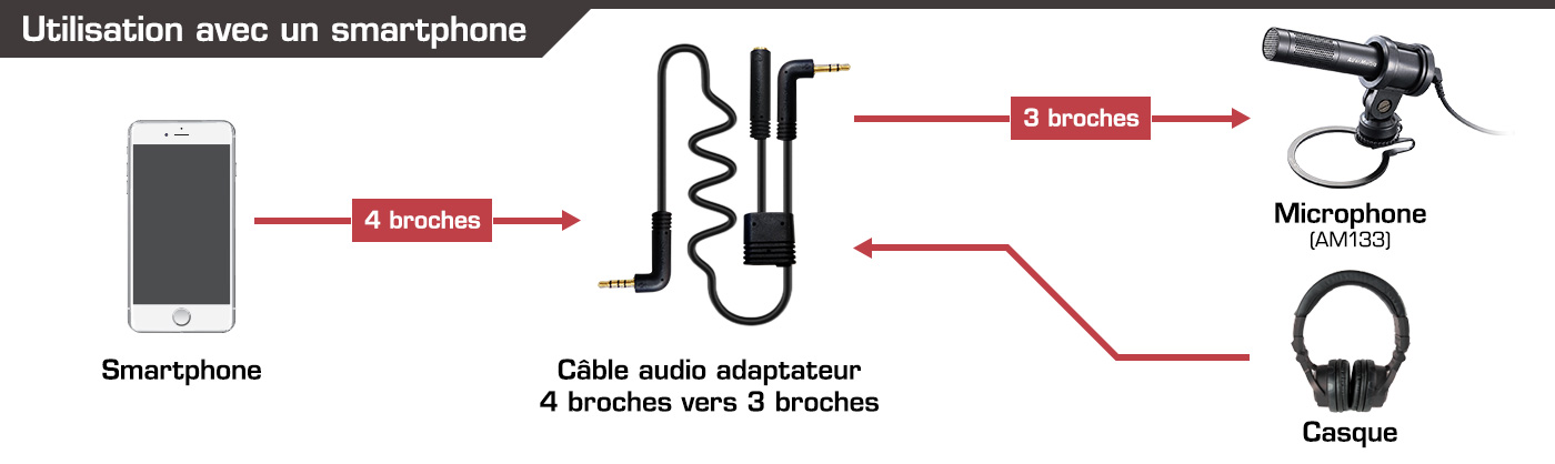 Le câble audio 3.5mm 4 broches vers 3 broches (inclus) permet de connecter simultanément le micro et un casque à votre smartphone. Écoutez l'audio du système sans débrancher le micro.