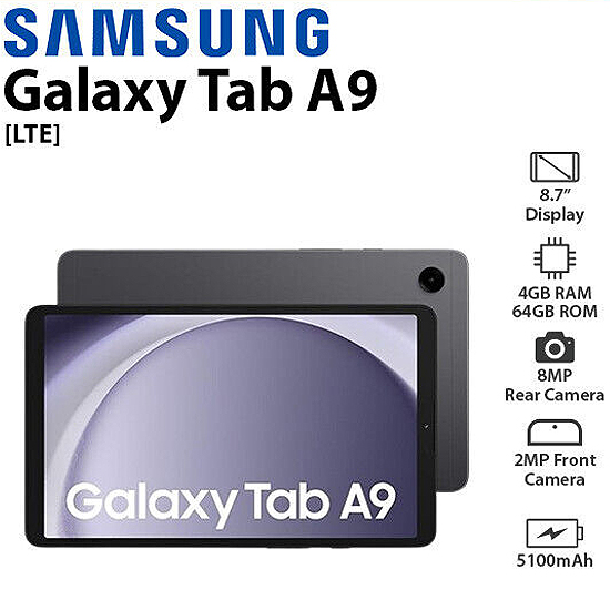 SAMSUNG Tablette Tab A9 LTE 8.7"800x1340 (WUXGA+), 60 Hz Navy MTK MT8781 (G99) 4Go 64Go Android 4G 2Mpx 8Mpx micro SD up to 1 TB Face Recognition BT 5.2 5,100 mAh 15W Data Cable C-to-C ( 1.0m) , Ejection Pin, Quick Start Guide 12M.