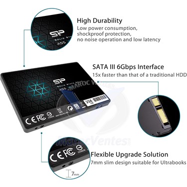 Technologie 3D NAND pour une fiabilité et une efficacité énergétique amélioréesEn appliquant le flash NAND 3D avancé, l'Ace A55 offre une fiabilité supérieure et une meilleure efficacité énergétique que les SSD traditionnels équipés d'un flash NAND 2D. L'A55 offre une endurance améliorée et une durée de vie de la batterie plus longue, ce qui vous permet de travailler plus longtemps sans recharger fréquemment votre ordinateur portable.Vitesses de transfert élevées pour un démarrage rapideAlimenté par un contrôleur de haute qualité et une mémoire flash NAND synchrone d'origine, l'A55 offre des vitesses de transfert incroyablement élevées qui permettent un temps de démarrage court, un chargement rapide des applications et un traitement rapide des fichiers.Technologie de cache SLC pour une amélioration des performances et une durée de vie plus longueL'A55 applique en particulier la "technologie de cache SLC" qui permet à toutes les données d'être écrites en premier dans la partie SLC et conduit à des performances d'écriture de pointe plus élevées. De plus, la technologie permet de réduire l'amplification en écriture et ainsi d'offrir une meilleure endurance et une durée de vie plus longue du SSD.Outil de surveillance de la santé SSD à téléchargement gratuit - Logiciel SP ToolboxL'A55 est livré avec un outil de surveillance de la santé SSD à téléchargement gratuit - le logiciel SP Toolbox, spécialement conçu pour vous permettre de surveiller facilement l'état de santé actuel d'un SSD. Ainsi, vous pouvez exécuter un test de performances, obtenir une évaluation globale de l'état de santé et vérifier des informations détaillées sur votre SSD, notamment l'espace utilisé sur l'appareil, la température de l'appareil, le nombre total d'octets écrits, S.M.A.R.T. l'état, l'état du compte d'effacement et les numéros de bloc.*Veuillez télécharger le logiciel sur le site officiel de SP.Absolument fiable avec la gestion des blocs défectueuxL'A55 est construit avec Bad Block Management, qui peut surveiller et remplacer en permanence les mauvais blocs pour maintenir votre système en bon état avec une durée de vie prolongée d'un SSD.Plusieurs techniques prises en chargeL'A55 est l'un des SSD les plus légers et les plus minces de sa catégorie, mais il est résistant aux chocs et aux vibrations car il ne contient aucune pièce mobile. De plus, S.M.A.R.T. Le système de surveillance et la technologie ECC sont équipés pour promettre une plus grande sécurité de transmission de données.Garantie de 3 ansL'Ace A55 est couvert par une garantie de 3 ans.*Veuillez enregistrer votre produit via le site officiel de SP pour obtenir les services complets de garantie du fabricant, l'assistance produit et plus encore.La boîte contient1 x disque SSD Silicon Power Ace A55 - Plus d'images (6)