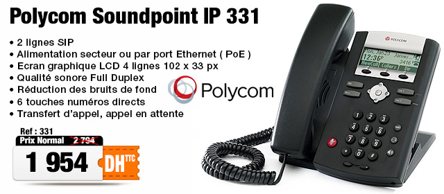 Le SoundPoint IP 331 est un téléphone SIP équipé de deux ports Ethernet 10/100 pour la connexion à un PC ou à un réseau LAN le IP 331 est la solution optimale et économique pour les petits bureaux ainsi que pour les opérateurs des centres d'appels