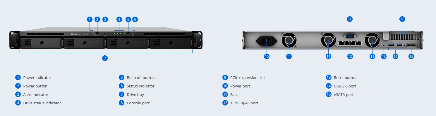 | Interfaces | 4 x Ethernet 1000Base-T - RJ-45 2 x USB 3.0 - Type A 1 x eSATA |