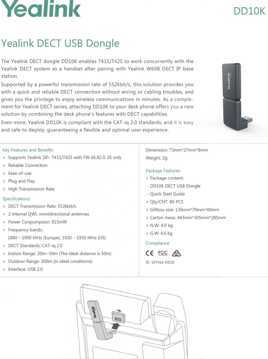 Le dongle DD10K Yealink DECT permet au T41S / T42S de fonctionner simultanément avec le système Yealink DECT en tant que combiné après l’appariement avec la station de base Yealink W60B DECT IP.