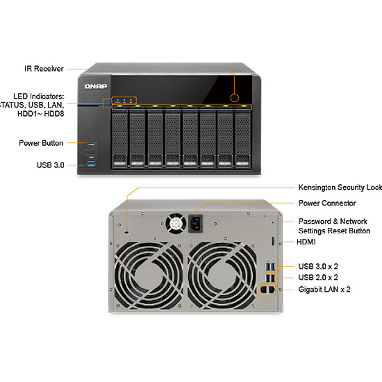 - 8-Bay NAS, 4 Go de RAM DDR3L (max 8 Go),