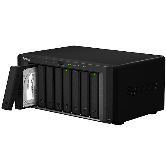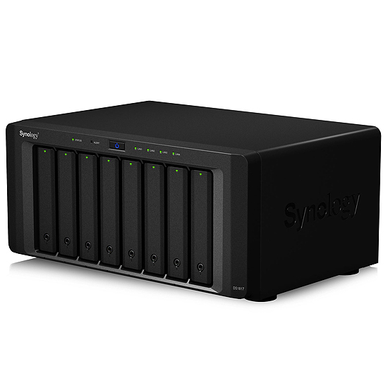 Le Synology DS1817 représente une solution de stockage à 8 baies, monté sur réseau et équipée d'un processeur quadri-coeur à 1,7 GHz, de 4 Go de RAM (extensibile à 8 Go) et de deux ports LAN Gigabit (+2 ports 10GbE), qui offrent un débit séquentiel en lecture supérieur à 1577 Mo/s et un débit en écriture supérieur à 739 Mo/s avec RAID 5 et tous les ports LAN en agrégation de liens. Le DS1817 offre une solution de stockage fiable et rentable, adapté aux entreprises et foyers de particuliers.