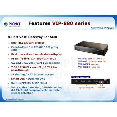 Basé sur de nombreuses années d'expérience dans la production de routeurs et de dispositifs de téléphonie sur Internet, PLANET présente un nouvel appareil de la famille des passerelles VoIP: le VIP-880.La passerelle VoIP PLANET VIP-880 est entièrement compatible avec les normes SIP et H.323, ce qui en fait une solution complète qui intègre les réseaux de communication vocale par paquets au réseau téléphonique public RTPC.La passerelle fournit non seulement des appels vocaux de la plus haute qualité, mais offre également des fonctions de partage Internet sécurisées et fiables pour la transmission de données et de voix.Le processeur DSP (TI) avancé et la toute dernière technologie VoIP permettent au VIP-880 de prendre en charge les connexions SIP et H.323. Jusqu'à 8 enregistrements SIP proxy ou H.323 Gatekeeper permettent à la passerelle d'établir des connexions dans des environnements H.323 ou SIP. Le VIP-880 est équipé d'un port réseau Ethernet et intègre une fonction de traduction d'adresse NAT qui permet de partager l'accès Internet lors de l'utilisation d'une adresse IP externe; Grâce à ces fonctions, les utilisateurs peuvent profiter d'une communication vocale et d'un accès Internet de haute qualité sans perturber le fonctionnement routinier du réseau.Dans le même temps, les passerelles VIP PLANET ont été conçues pour assurer confort et facilité d'utilisation. VIP-880 maintient non seulement la tradition de PLANET - la plus haute qualité de communication vocale et de transmission de données par fax dans les réseaux IP, mais élimine également la nécessité d'impliquer les ressources humaines pour construire des réseaux VoIP. Grâce à l'architecture optimisée H.323 / SIP, le VIP-880 est la solution idéale pour les connexions vocales P2P pour réduire le coût des appels, et grâce à la fonction de traduction des paquets, il permet la connexion d'un réseau à un système PBX traditionnel.Le client intégré PPPoE / DHCP / DDNS et la possibilité de fournir jusqu'à 8 connexions simultanées vous permettent d'établir une communication vocale depuis n'importe où dans le monde. PLANET VIP-880 dispose d'une interface de gestion conviviale, intuitive et riche en fonctionnalités (réseau / telnet / console), ce qui simplifie grandement le service et vous permet de construire un réseau VoIP en peu de temps. En outre, il est possible de gérer à distance, ce qui permet à l'administrateur de surveiller l'état du réseau et des périphériques, et d'effectuer des procédures de configuration et de maintenance via un navigateur Internet ou une session Telenet. En outre, l'appareil vous permet de surveiller l'état des canaux de communication vocale et fournit une diffusion optimisée des paquets vocaux via des réseaux IP privés ou publics (Internet).Caractéristiques