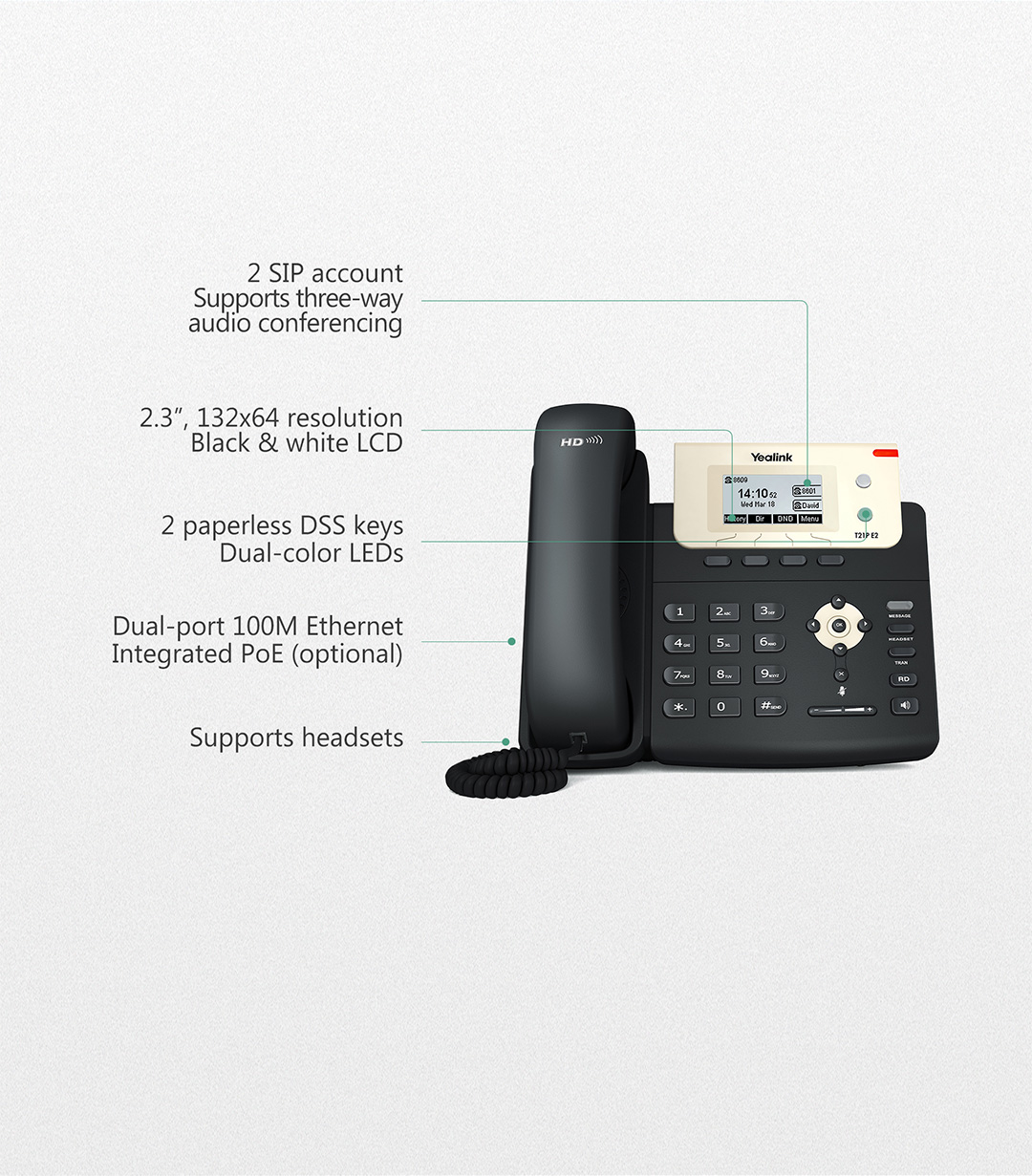 Téléphone IP avec écran et prise casque, 2 comptes SIPLe téléphone Yealink T21P est un poste professionnel capable de gérer 2 comptes SIP. Avec ses fonctions d'auto-provisionnement, d'auto-configuration et d'auto-actualisation, il convient au entreprises recherchant un téléphone facilement manageable.Il s'adapte à votre environnementAvec le Yealink T21P, vous choisissez entre une alimentation PoE (via câble Ethernet) et une alimentation électrique classique (via bloc secteur - non inclus).Gestion évoluée des appelsLe Yealink T21P offre les fonctionnalités de téléphonie suivante: identification du noms et du numéros de l'appelant, transfert d'appel, conférence à 2, communication interne...Ultra professionnelEquipé de la puce TI TITAN, d'un écran LCD 2 lignes, d'un switch Ethernet 2 ports RJ45 10/100 M et d'un mains libres full duplex, le Yealink T21P est idéal pour une utilisation intensive en entreprise.Compatible avec les environnements SIP:* Alcatel-Lucent* Aastra* Avaya* 2CX* Asterisk* SipleoCaractéristiques